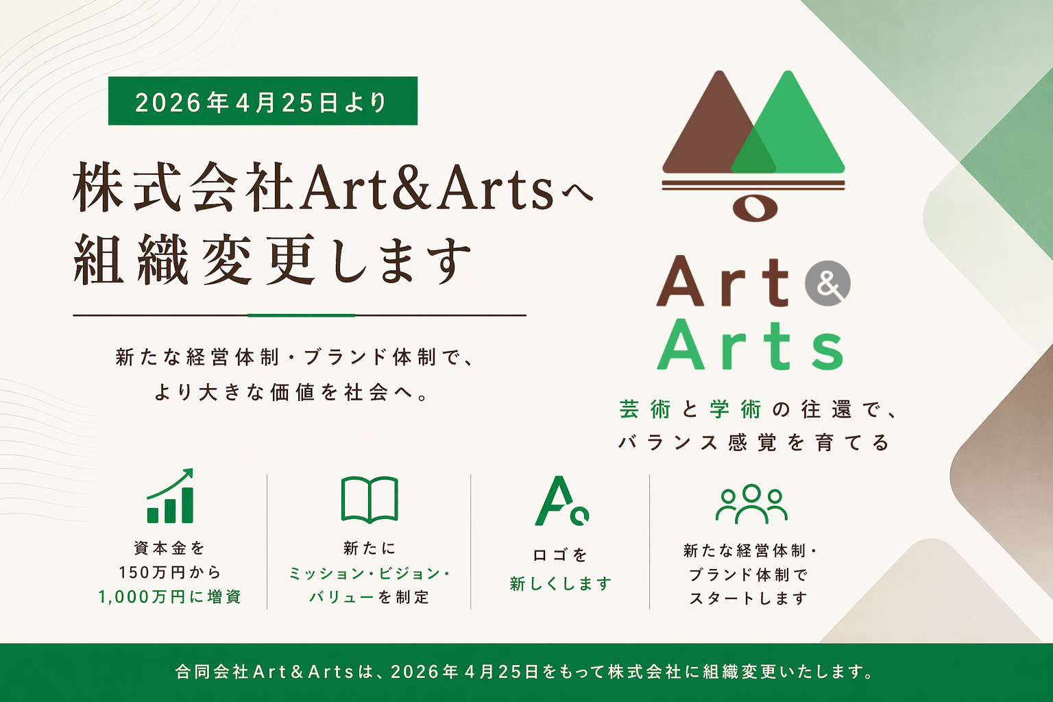 株式会社Art&Artsへの組織変更および新経営体制・新ブランド体制のお知らせ